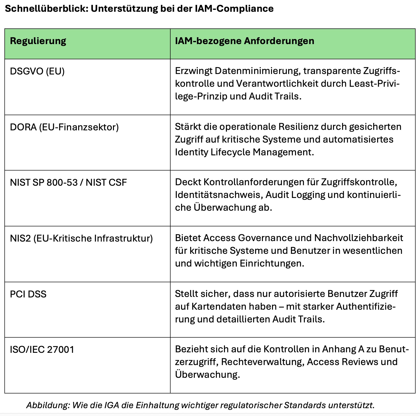 Als internationaler Standard für Informationssicherheits-Managementsysteme (ISMS) verlangt ISO 27001 einen strukturierten Umgang mit Sicherheitsrisiken. IAM-Prozesse sind integraler Bestandteil dieses Konzepts. IGA-Lösungen unterstützen wiederum die Etablierung und kontinuierliche Verbesserung des ISMS durch gezielte Maßnahmen zur Verwaltung von Identitäten und Rechten – von der Risikobewertung bis zum Nachweis der Umsetzung.