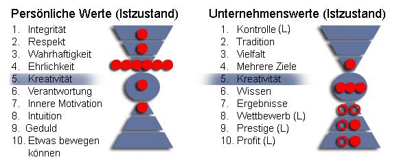 Der angestrebten Zustand ist also der folgende: Das Unternehmen erreicht nachhaltig seine Ziele unter Berücksichtigung seiner Werte. Die Mitarbeiter haben diese Werte mit bestimmt, sodass es den meisten leicht fällt, diese Eigenschaften zu leben. Je höher die Übereinstimmung von persönlichen Werten und Unternehmenswerten ist, umso stärker ist die Selbstverwirklichung am Arbeitsplatz und damit die "natürliche" oder intrinsische Motivation.