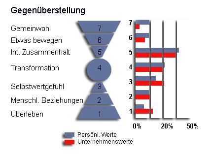 Die Auswertemöglichkeiten sind, trotz des rel. geringen Inputs von dreimal 10 Eigenschaften, erheblich. Es entsteht, häufig zum ersten Mal für ein Unternehmen, ein klares, objektives Bild der Unternehmenskultur mit vielen einzelnen Facetten. Die Tiefenschärfe wird durch unterschiedliche Datenschnitte, z.B. nach Hierarchieebenen und/oder Geschäftsbereichen oder auch nach Regionen weiter erhöht. Die nachfolgenden Abbildungen können, schon aufgrund des hier vorgegebenen Rahmens nur Andeutungen der Möglichkeiten sein. Grundsätzlich lässt sich zu der verwendeten Software Corporate Transformation Tools sagen, dass sie qualitative Aussagen in fassbare Daten verwandelt und dadurch als Mess- und Vergleichsinstrument für Unternehmenskultur geschaffen wurde.