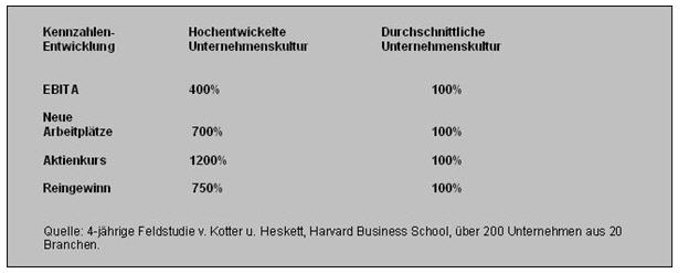 Praktisch alle einschlägigen Studien zum Thema Unternehmenskultur und -werte bestätigen die hohe wirtschaftliche Relevanz. Wertebasierte Unternehmensführung erleichtert also nicht nur die Führung der Mitarbeiter sondern zeigt auch signifikanten monetären Nutzen. Die u.a. Studie von Kotter und Heskett, Harvard Business School, zeigt deutlich, wie sich Unternehmen mit einer bewusst gepflegten Unternehmenskultur von eher durchschnittlichen unterscheiden.