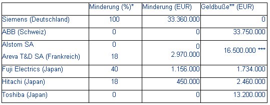 (12.10.09) - Die Europäische Kommission hat Geldbußen in Höhe von insgesamt 67,644 Millionen EUR gegen die sieben Unternehmen ABB, Areva T&D, Alstom, Fuji Electrics, Hitachi und Toshiba verhängt, weil sie gegen das in Artikel 81 EG-Vertrag verankerte Verbot von Kartellen und wettbewerbswidrigen Verhaltensweisen verstoßen haben. Siemens war ebenfalls beteiligt, wurde jedoch nicht mit einer Geldbuße belegt, da das Unternehmen der Kommission die Existenz des betreffenden Kartells enthüllte.